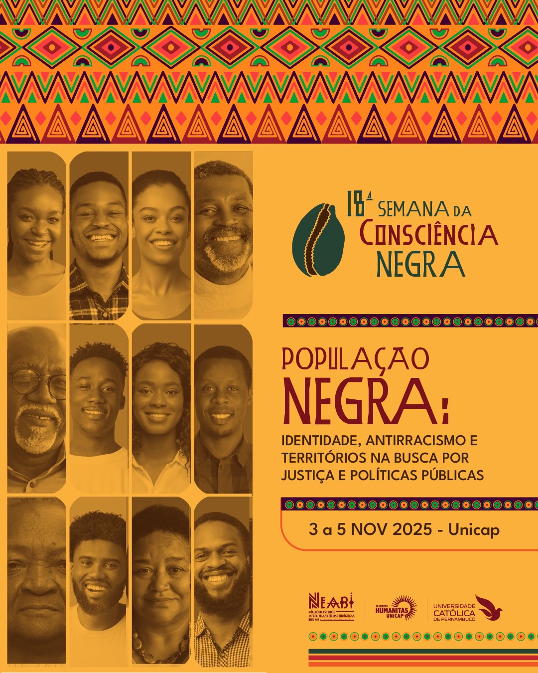 Com o tema “População negra: identidade, antirracismo e territórios na busca por justiça e políticas públicas” a 18ª Semana da Consciência Negra da Unicap acontece de 3 a 7 de novembro e envolve além da abertura oficial, lançamento de livro, oficina, exposição fotográfica e a Feira Preta. A programação é gratuita e aberta a docentes, discentes e comunidade em geral.