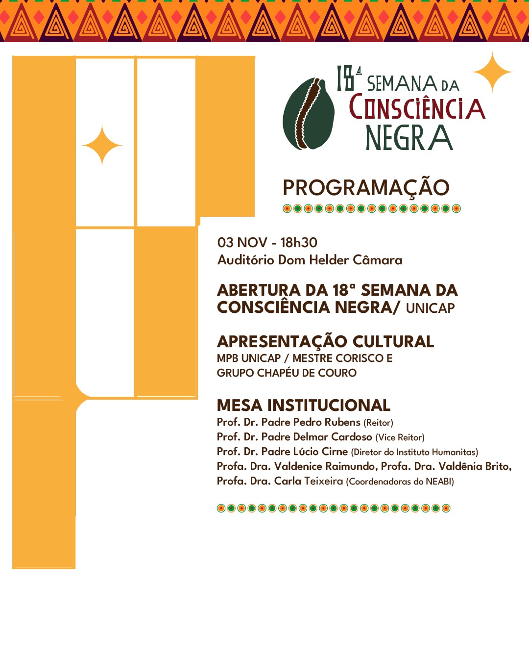 A programação tem início às 18h do dia 3, no auditório Dom Hélder Câmara, com apresentação do MPB Unicap e do grupo de Capoeira Chapéu de Couro. Na sequência, abertura com o reitor Pe. Pedro Rubens, o vice-reitor, Pe. Delmar Cardoso, o diretor do Instituto Humanitas, Pe. Lúcio Cirne, a Pró-Reitora de Pesquisa e Pós-Graduação, Profa. Valdenice Raimundo, junto com as professoras Valdênia Brito e Carla Teixeira, que também respondem pela coordenação do Neabi Unicap.
