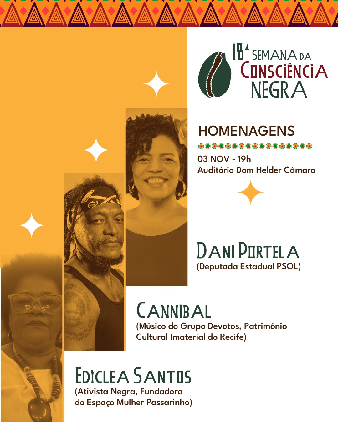 As Profas. Dras Valdênia Brito e Carla Teixeira relembram que em 2023 o Neabi iniciou homenagens a pessoas de destaque na cultura, no movimento negro e na luta antirracista. “Em 2025 estamos celebrando a ativista e fundadora do Espaço Mulher Passarinho, Ediclea Santos, a advogada e deputada estadual (PSOL), Dani Portela e ainda o músico Cannibal, da banda Devotos, que em 2024 recebeu o título de Patrimônio Cultural Imaterial do Recife”, informam as coordenadoras do Neabi. “A programação inclui ainda lançamento de livro, oficina, exposição fotográfica e a Feira Preta, de empreendedoras negras”.